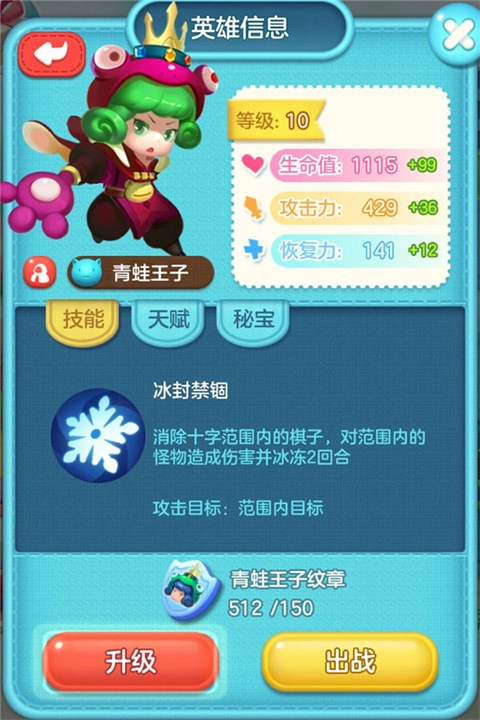 青蛙王子是蓝色阵营的英雄,具备不俗的生命值和强大的冰封技能,能够清除十字范围内的棋子,同时对怪物造成伤害并施加冰封效果。其天赋包含冰封持续回合延长、攻击力提升、冰封伤害增强等加成效果。青蛙王子与白马王子搭配使用时,对部分强力BOSS能起到非常出色的限制作用。