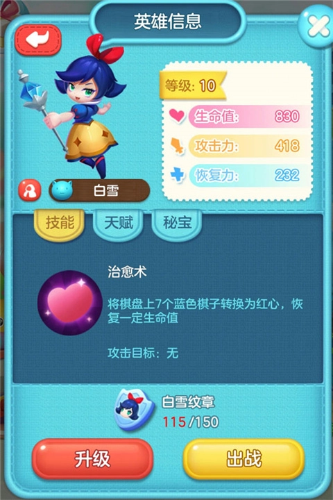 白雪公主属于蓝色英雄,续航能力出色。她的治愈术能把7个蓝色棋子转化为红心,同时为玩家恢复一定血量。此外,她的天赋包含恢复效果翻倍、能量消耗降低、蓝色棋子全部转换等增益。当面对需要奶妈的关卡时,像存在持续伤害类怪物(比如毒蜘蛛、炸药桶哥布林、仙人掌)的关卡,搭配白雪公主的英雄阵容会是最优解。