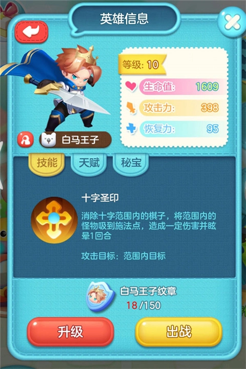 白马王子堪称白色阵营中的英雄角色,其核心特性在于拥有较高的生命值,并且同时具备位移与控制类技能。该英雄在游戏前期即可获取,实用性相当突出。他的技能“十字圣印”不仅能够清除十字范围内的棋子,还能将范围内的怪物吸引至施法位置,并且使这些怪物陷入1回合的眩晕状态。此外,他的天赋包含提升生命值、延长眩晕持续回合、回复能量等增益效果,凭借这些优势,白马王子成为了游戏中最出色的肉盾与辅助英雄之一。