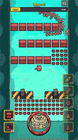 2、采用卡通萌趣的画风与地牢塔防的场景设计,二头身的红猪队员造型十分可爱;搭配地牢隘口、高台等多样地形元素,整体色彩鲜明且富有探索感,战斗画面轻松无压抑感,能够适配全年龄段玩家。