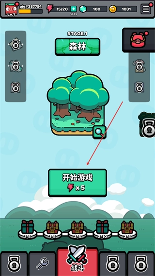1、挑选森林关卡,耗费5点体力并点击开始游戏,即可进入战斗环节。