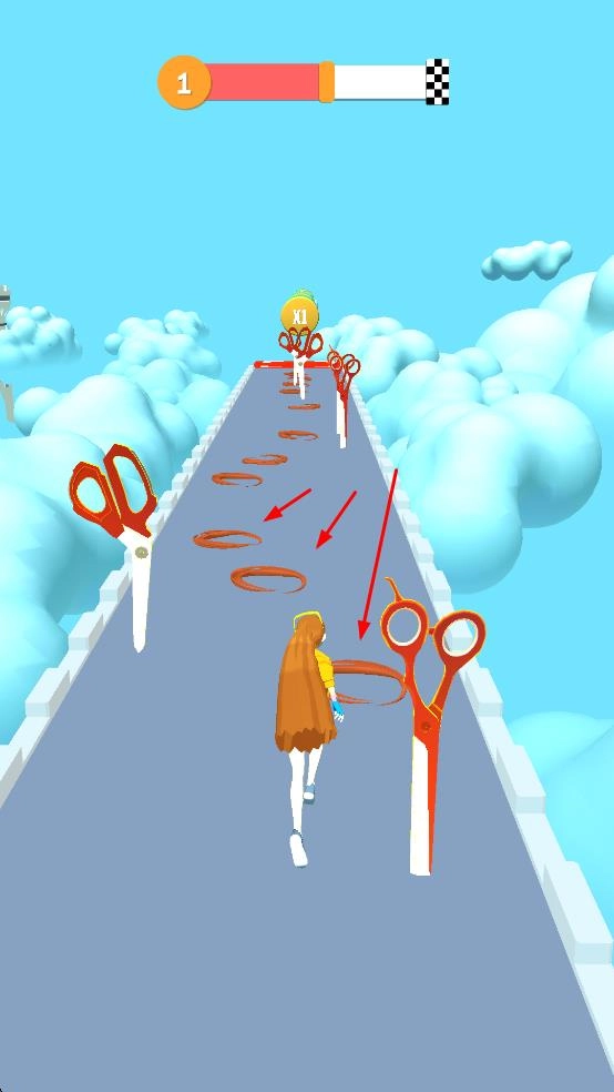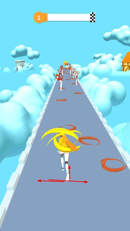 在移动过程中,避开道路上的剪刀障碍物,同时收集散落的头发道具。