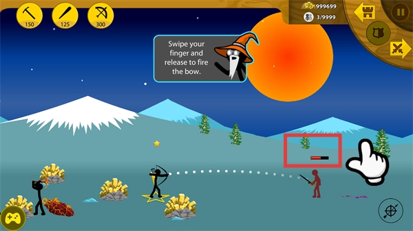 2、战斗过程中请遵循【Swipe-your-finger-and-release-to-fire-the-bow.】的提示,通过滑动手指并释放的操作来发射弓箭攻击敌方。