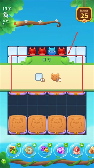 1、游戏开始先明确目标,需收集【方块-12】和【猫咪饼干-34】,利用剩余【步数-25】优先消除猫咪图案,加快目标进度。