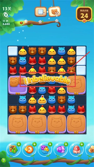 2、触发连消后出现【Unbelievable】提示,分数提升明显,可尝试创造更多同类型元素组合,触发特效来快速完成剩余目标。