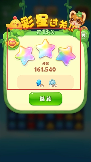 4、过关后获得【三颗星】评价,分数达【161540】,需保持连消节奏,合理规划步数,争取高分和完美过关评价。