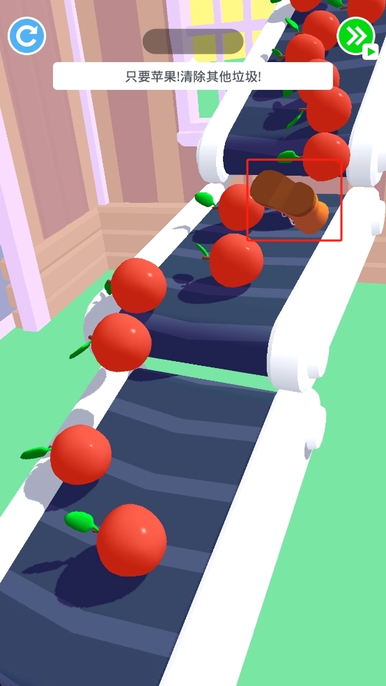 在分拣关卡中,需识别传送带上的非苹果物品,点击清除棕色垃圾,保留苹果,以满足分拣任务的条件。