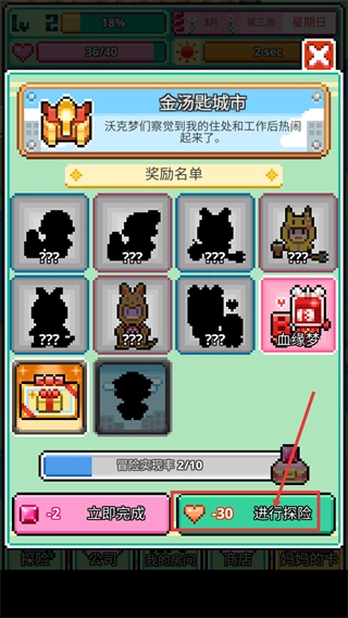 是一款QuickTurtleCo.Ltd.打造的创意经营模拟作品,以宝可梦玩法为灵感内核,重构为“董事长招募员工”的趣味经营场景。玩家将以公司掌舵人的身份,从三名初始员工中择一开启事业,通过穿梭城市签约“沃克梦”员工、优化团队配置实现公司壮大,全流程贯穿着对经典IP的趣味致敬,却又跳出传统经营游戏的严肃框架,为玩家带来轻松解压又充满策略感的独特体验。1、进入【金汤匙城市】,可选【立即完成】-耗2或【进行探险】-耗30推进,还有奖励名单可解锁。