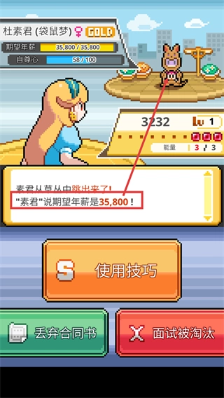 2、遇到【杜素君】,其【期望年薪】达35,800/35,800、【自尊心】为58/100,对方跳出后称期望年薪是35,800,可点【使用技巧】互动。
