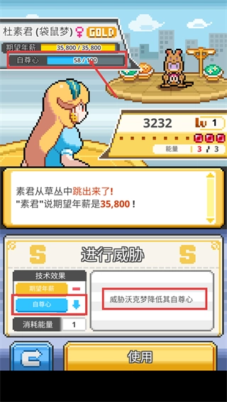 3、面对【杜素君(袋鼠梦)】,可使用【S-进行威胁】技巧,该技巧能降其【期望年薪】与【自尊心】,使用需耗能量1,点击【使用】触发。