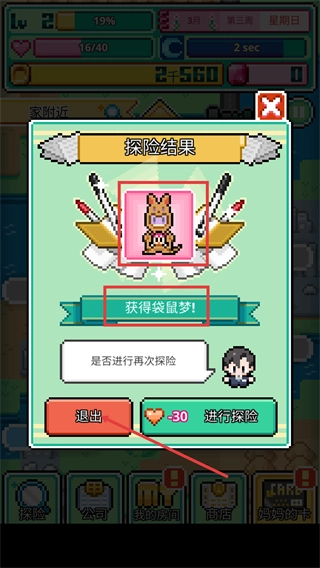 4、完成探险后会显示【探险结果】,成功获得【袋鼠梦】,之后可选【退出】或耗30再次点【进行探险】来获取更多奖励。