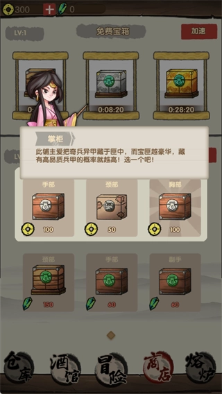 在江湖客栈的商店里,掌柜给你备好了各种宝箱,里面有头盔、武器、护甲这类稀有装备。宝箱品质越好,开出神兵的几率就越高!不管是金币还是绿宝石都能用来兑换,而且还有定时刷新的免费宝箱,每天登录就能领,福利超多,不氪金也能变得很强!