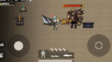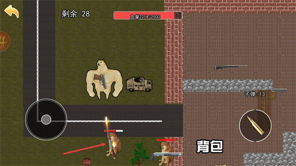 2、面对右侧持武器的敌人,用左侧轮盘走位,点击射击按钮攻击,关注【血量】【子弹】,适时调整策略。