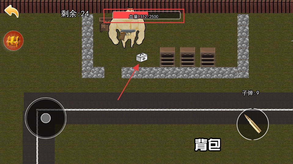 2、在场景中找到【急救箱】,靠近后互动可恢复血量,注意界面显示的剩余数量和当前血量状态。