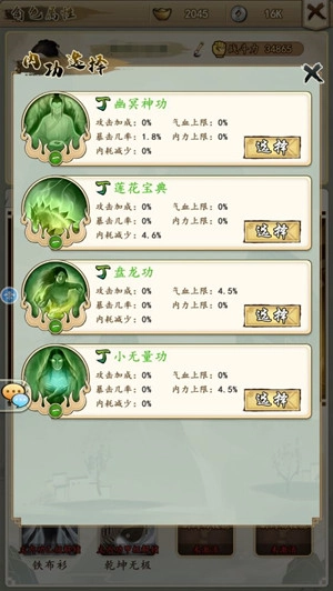 基础内功包含五种:混元功能提升暴击效果,紫霞真气可增强攻击能力,吸功大法则能减少内力消耗,寒阴真气有助于增加气血数值,罗汉真气能够提升内力上限。