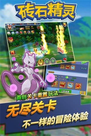 1、在精灵世界里四处探险,捕捉各种各样的砖石精灵,通过属性克制和技能组合来进行回合制战斗。