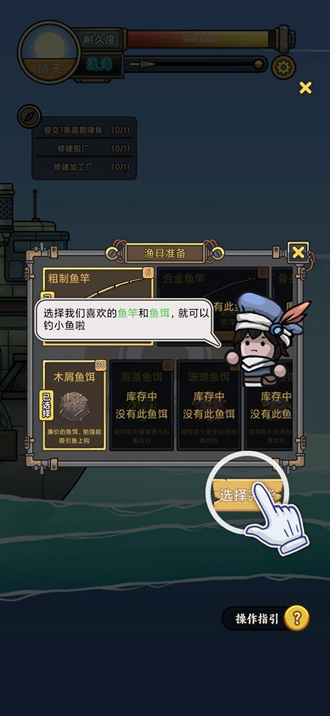 出海捕鱼玩法:玩家需驾船出海,打开船尾的甲板,挑选适配的钓竿与鱼饵,耐心等待鱼儿咬钩。