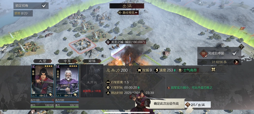 7、然后点击出征,与敌人进行战斗,成功消灭敌军后,即可收复土地;
