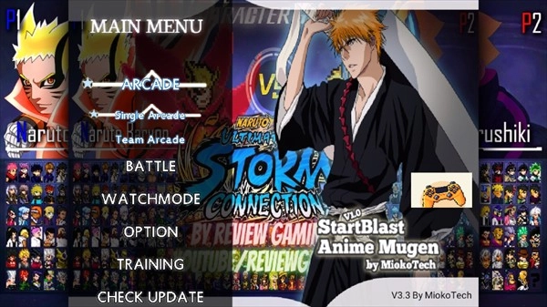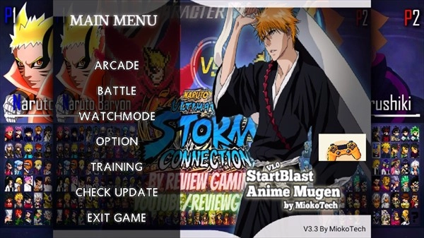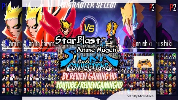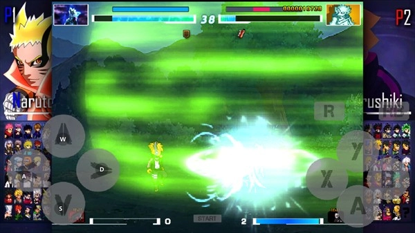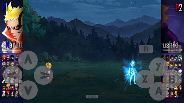 1、打开游戏,我们能够看到一个非常酷炫的游戏界面,在这里我们能够看到重离子鸣人以及楔状态的博人,我们在这里点击中间的按钮便可以进入到游戏主界面。