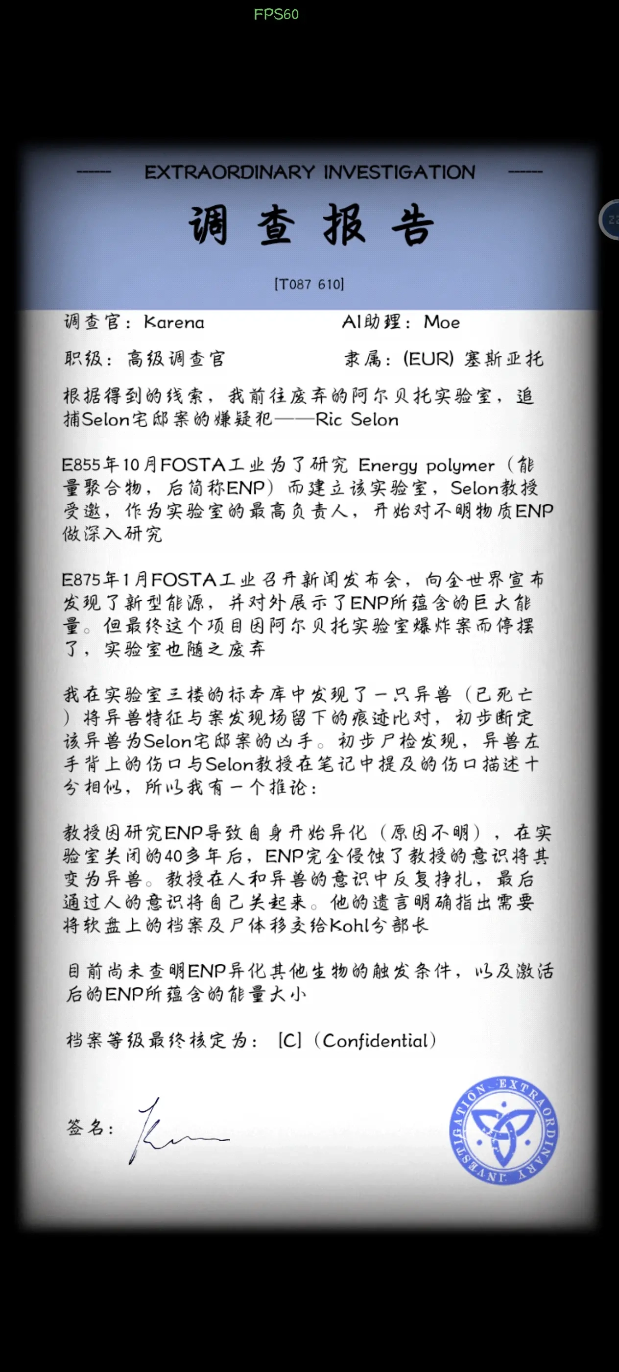 非常调查局异兽是一款剧情推理文字游戏,准备下班的K和M突然接到上级的紧急任务调查寻找失踪的教授,本来还在埋怨的M转过身看到长官来了瞬间唯唯诺诺,长官给出了现场一些照片据说教授可能兽化需要控制事态发展。在非常调查局异兽游戏中,玩家将以M的视角进入游戏对前往偏僻森林的实验基地搜寻异化的教授。