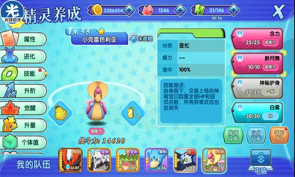 在精灵远征玩法中,精灵的PP值和血量无法自动恢复。此外,蛋神的治愈之愿技能在远征模式下被限制使用,这时可以选择使用美梦神克雷色利亚——它的新月舞技能能够为下一只登场的精灵恢复PP、血量,并解除异常状态等。