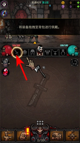 3、按照指引,将制作好的装备拖拽至红色箭头指向的背包武器栏位置,完成装备的佩戴准备操作。