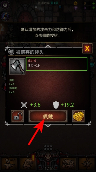 4、在装备详情界面,确认属性加成后,点击红色箭头指向的佩戴按钮,完成装备的最终佩戴。