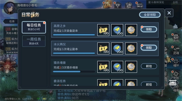 每日奖励涵盖了高原之乡、冰火两仪、猎杀魂兽以及日常周常奖励等内容。