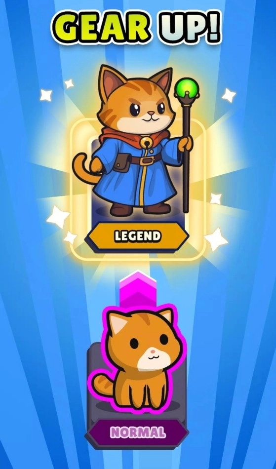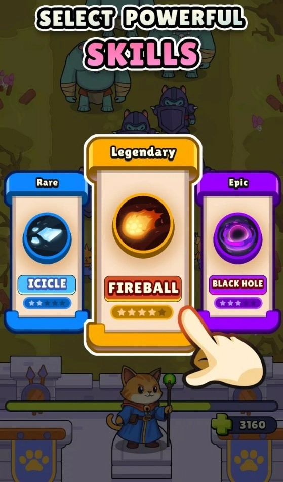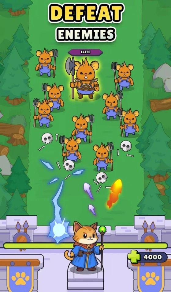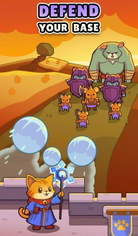 作为猫咪城堡最后的猫巫师,必须站在抵御老鼠大军进攻的最前端,在你身后的不止是猫咪城堡的荣誉还有成千上万的猫咪百姓,海量的老鼠大军迎面而来,玩家通过猫魔法不断击溃他们的战线,随着关卡的推荐,猫巫师也在战斗中变强,推进到一定的关卡进度就会获得3选1技能的机会用于对抗更强的老鼠敌人的出现。