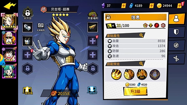 游戏开局的新手教程阶段会赠送一个贝吉塔·超赛,我把它作为副输出使用。接着用贝吉塔·超赛来提升等级、推进关卡,当主线副本推到1-8时,就能获得平民玩家口中的强力角色超赛神悟空,大家通常简称他为红空。之后我将超赛神悟空设定为主输出,再把贝吉塔·超赛进行重生操作,把释放出的资源集中投入到主输出身上。