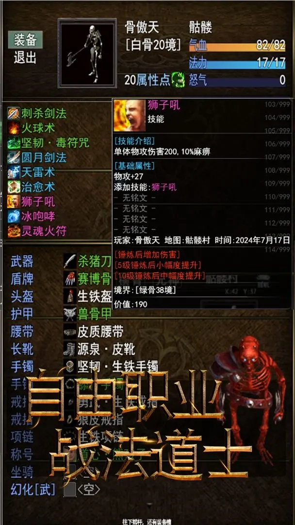 傲天骷髅传是一款设定在奇幻架空世界的角色扮演游戏。玩家将化身为一名骷髅勇士,在沃玛大陆上展开冒险之旅,不断打怪、修炼横骨和元神。游戏引入了新的妖魄玩法和丰富的装备系统,同时融合了战法道三合一的职业设定,为玩家带来了全新的游戏体验。