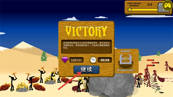 3、获胜后会出现【VICTORY】提示,点击【继续】按钮,就能得到【520131】钻石和【WOODENCHEST】的奖励。