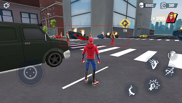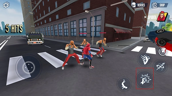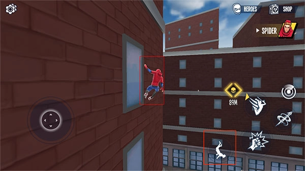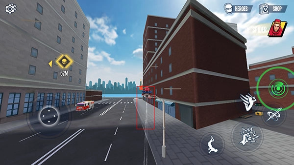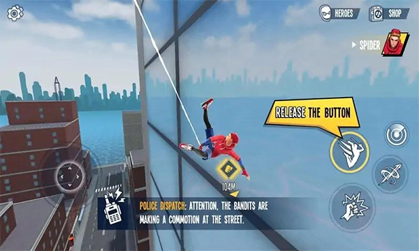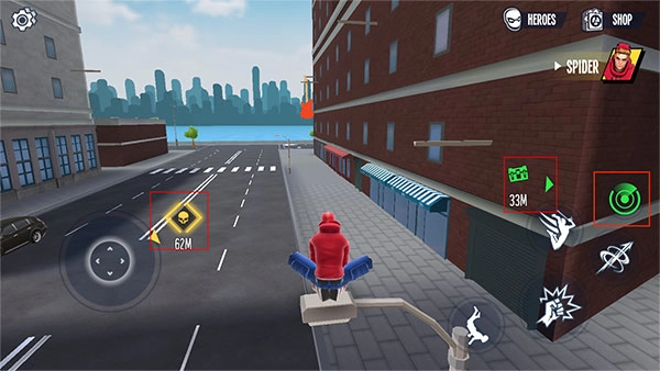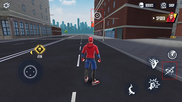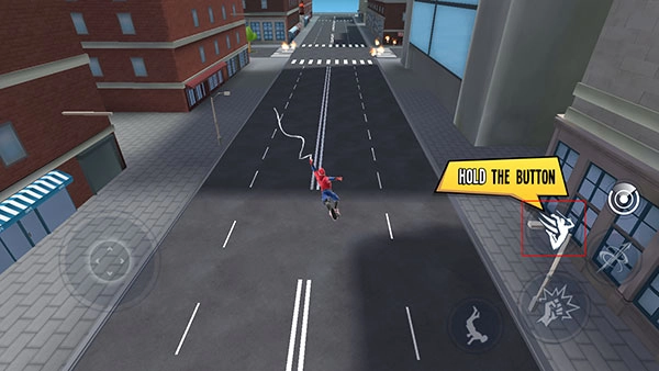 进入游戏后,长按图中所示的按钮,就能发射蜘蛛丝,在城市里荡来荡去。