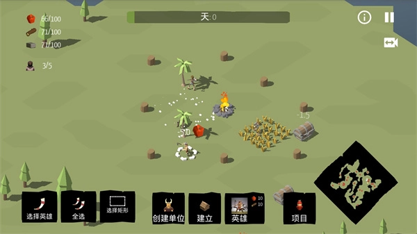 资源收集与基地建设:玩家需建造农场、矿山并种植树木来获取资源,这些资源将用于基地的建设与升级。