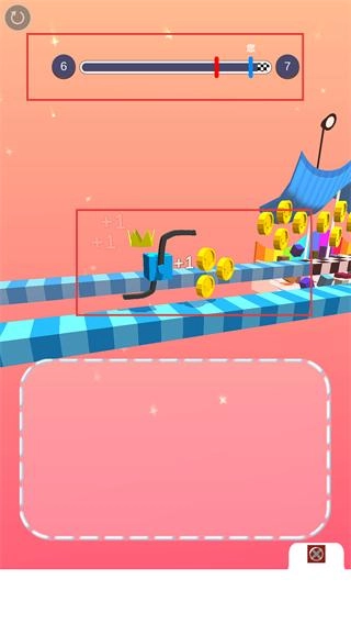 3、拾取【+1】类增益道具与【金币】,积累优势的同时,加快向【7】终点的推进速度。
