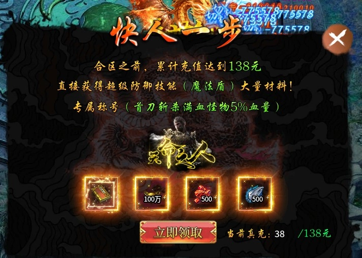 “快人一步”累充138元即赠魔法盾,该道具从5大陆起可产出。