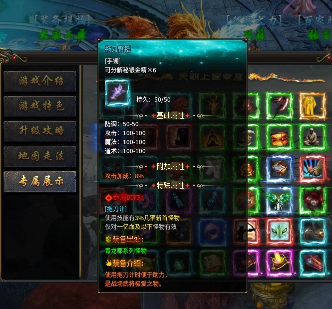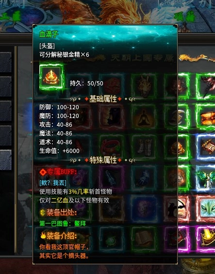 前六件装备在二大陆就能获取,剩下的两件则需要前往玄武郡,击败那里特定的两种蓝色名称的怪物才能得到。