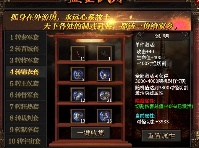 在游戏里,玩家能够获取大量装备,而收集套装还能获得额外的属性加成。