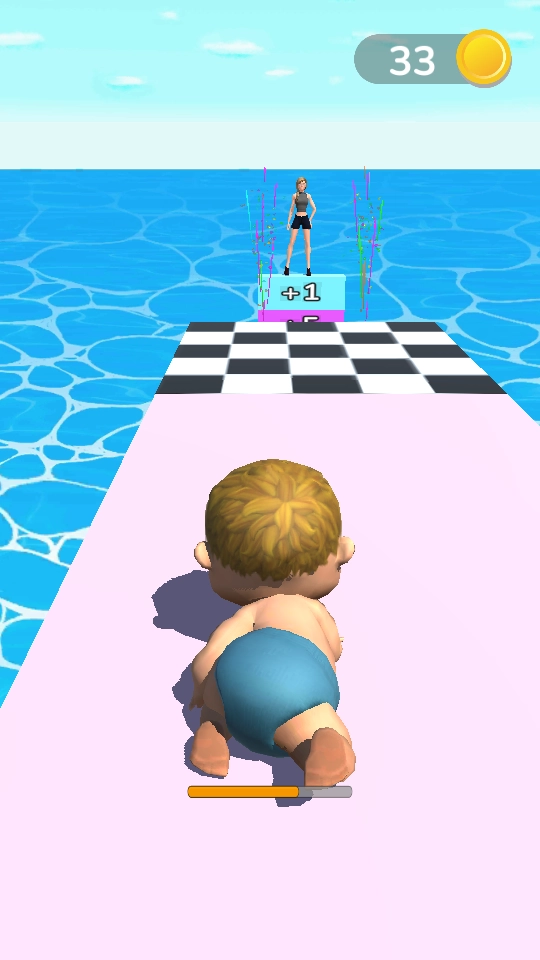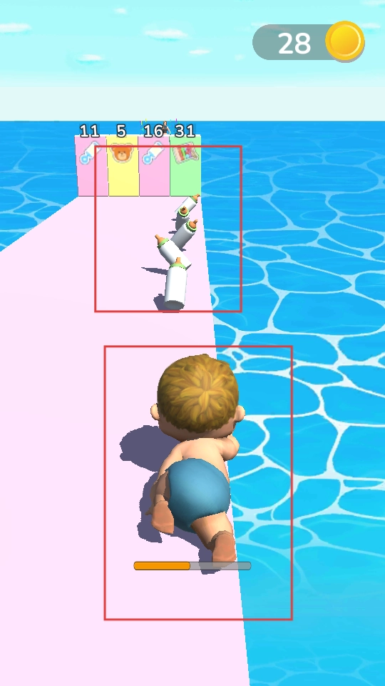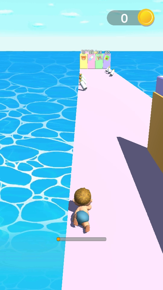 宝宝在跑酷过程中通过爬行收集大量奶瓶,收集的奶瓶数量越多,成长速度就越快,能从幼小状态逐步成长为大宝宝,完成清晰可见的成长转变。