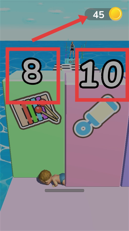 宝宝在奔跑途中碰到带有数字的方块时,要对数字进行判断并选择撞击,通过计算或数字匹配的方式,助力宝宝顺利通关并积累金币。