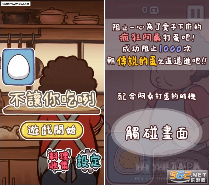 谁说当一颗蛋就只能等着被吃掉!在「不让你吃咧」这个游戏里,这颗蛋可叛逆得很——每次阿桑准备打蛋时,藏在蛋壳里的蛋黄就会立刻化身猛男模样,拼命阻止蛋壳被打破,就是死也不让人吃!可阿桑也不是好惹的,忍到极限就会