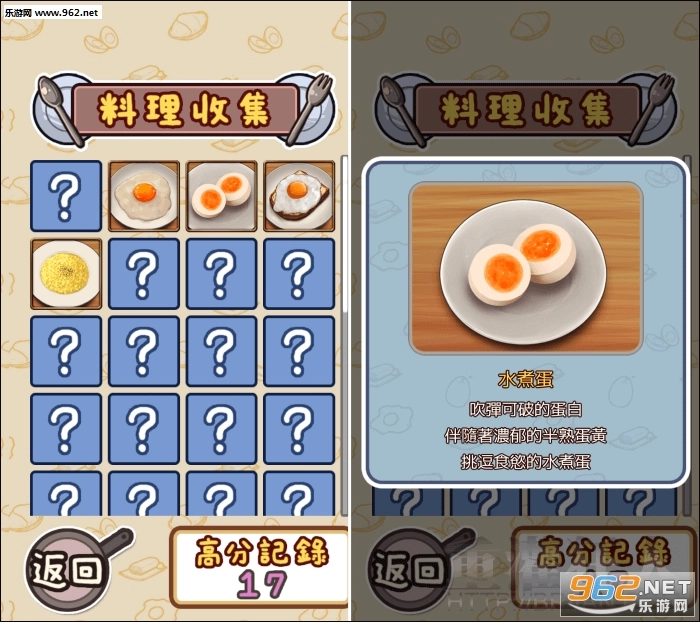 收集成功阻止打蛋的次数,就能解锁各式各样美味的料理图鉴啦!