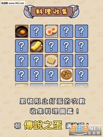支撑蛋壳;不过要是没能跟上阿桑的节奏,失手次数达到4次,蛋壳就会碎裂,蛋也会被做成各种蛋料理!根据成功阻止打蛋的次数差异,你能收集到各式各样的料理,这些料理都会被收录在料理图鉴里。据说当阻止次数达到1000次时,传说中的蛋就会出现哦!想了解这颗蛋最终的结局吗?那就奋力阻止这位疯狂的阿桑吧!
