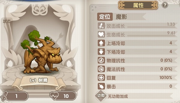 树精: 树精在精灵阵营中扮演坦克角色,生命值成长属性较为出色,但攻击成长表现平平。其技能机制为每回合对我方当前血量最低的英雄,造成等同于自身最大生命值的伤害——因此在战斗前期,树精尚未积累足够生命值时,骚扰敌方的能力相对薄弱;而到了后期,需格外留意我方输出位的血量是否处于最低状态,以防输出角色承受过多不必要的伤害。