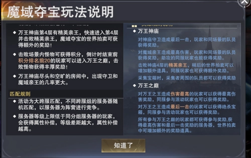 魔域夺宝是限时挑战活动,玩家可与其他服务器玩家一同进入魔域,争夺宝藏。每周一、周五晚8点30分,开放半小时,玩家等级要达到170级才可以参与。