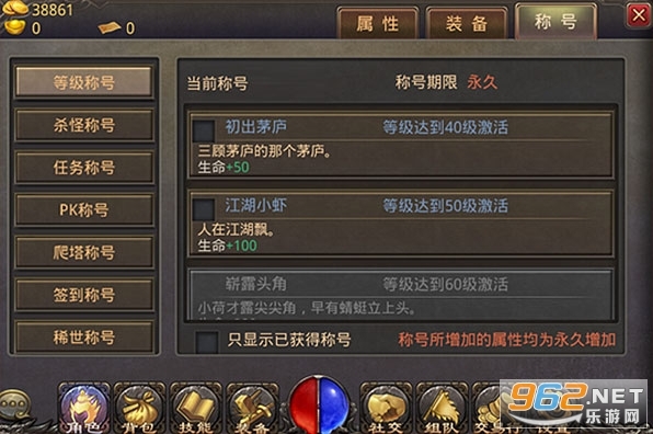 游戏里设有众多成就目标,达成对应的成就,就能获取相应的称号,每个称号都能增加一定的属性,而且这些属性是永久提升的。大家要尽量多完成成就来增强自身的战力哦!