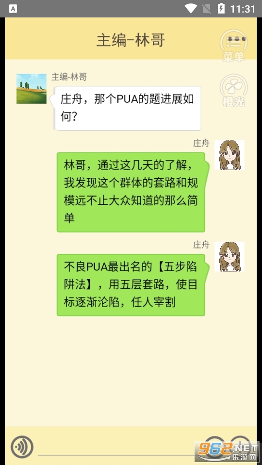 这是一款很有创意的文字恋爱休闲游戏,玩家在游戏里得深入研究各种pua相关的话术,还要隐藏女记者的身份悄悄潜伏在他们当中,剧情故事挺有趣的,快来体验吧!