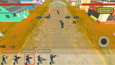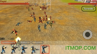 点击左下角选择小兵或军队单位,接着点击任意位置进行部署。使用右侧的操纵杆来移动场景,但要仔细规划你的战略——部分士兵攻击精准且射程远,坦克能对区域内所有单位发起攻击,机器人则战力极强。