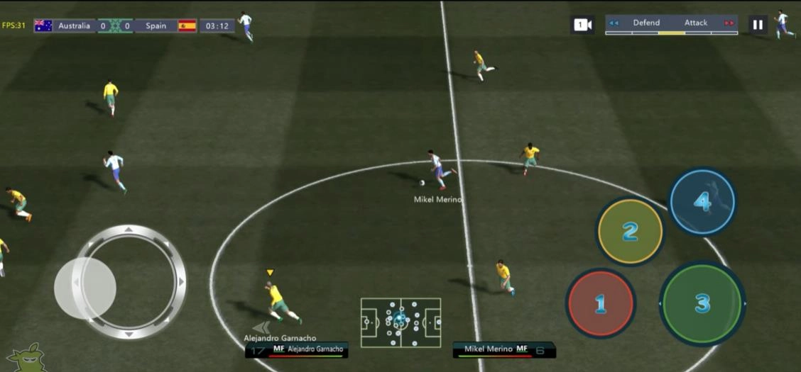 3、在比赛过程中,玩家需通过方向圆盘来操控球员的移动。其中,圆盘的内圈区域对应普通移动速度,外圈区域则对应加速移动状态。
