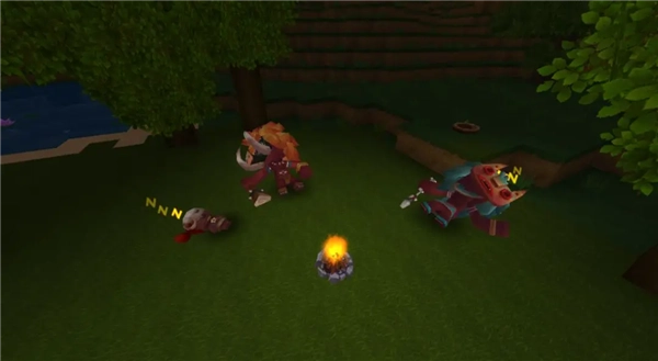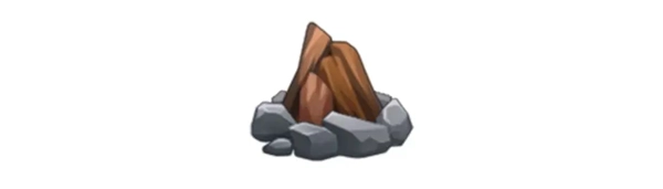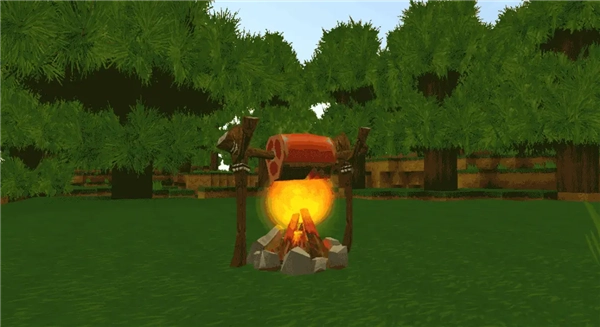 首先我们来认识新道具:篝火,制作篝火非常简单,只需要果木和岩石块即可,篝火需要配合我们熟悉的生肉和火把使用。